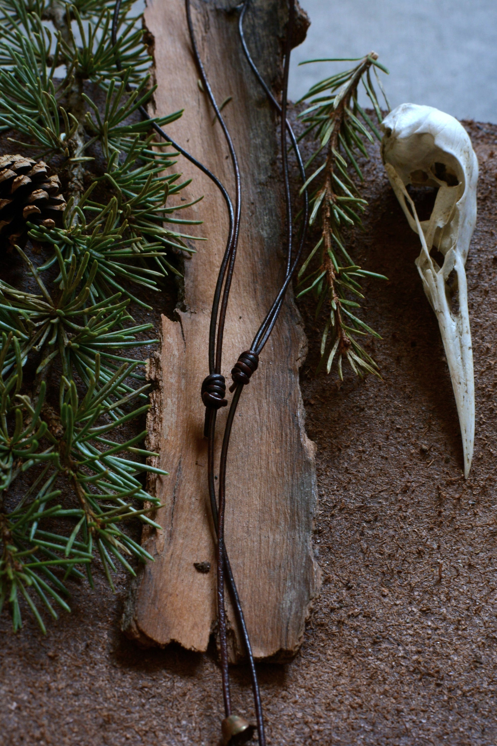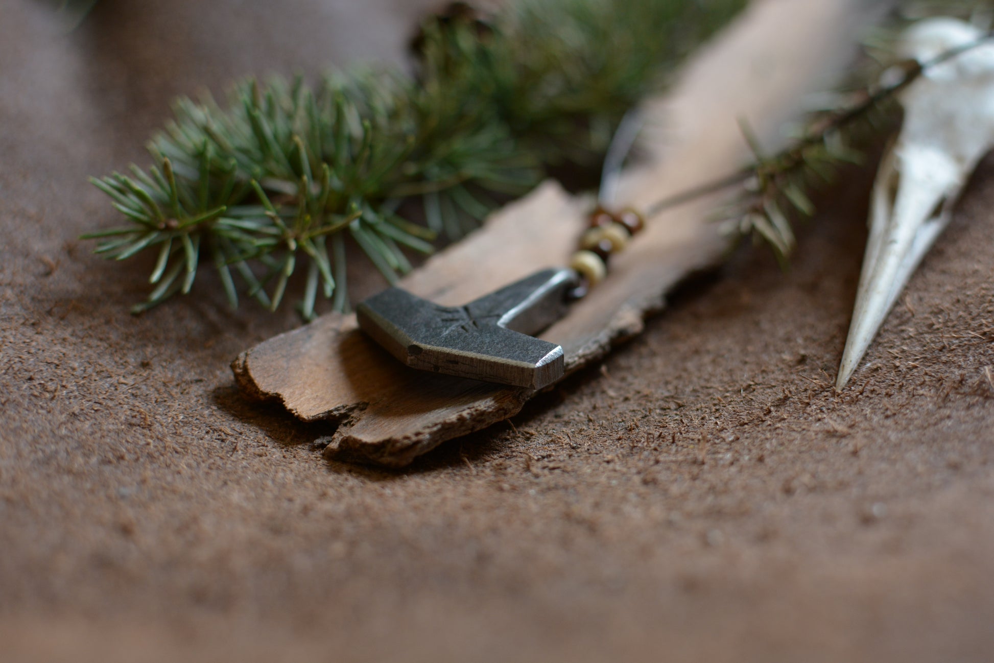 Ce pendentif en fer forgé mis en forme et martelé dans les flammes de la forge porte les marques du marteau et de l'enclume. Il a ensuite été engravé à froid à la main et monté sur un cordon en cuir ajustable orné de perles en os.