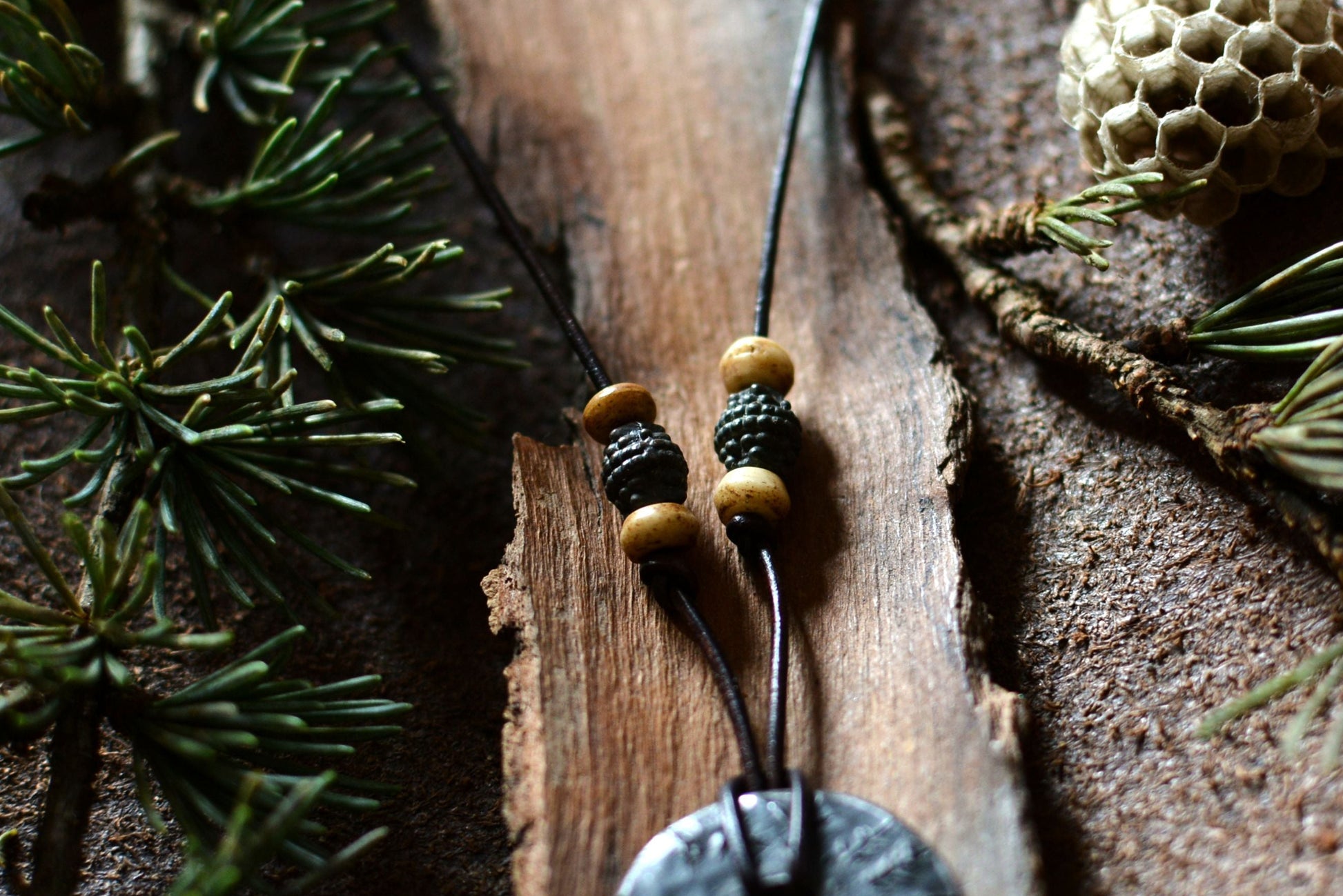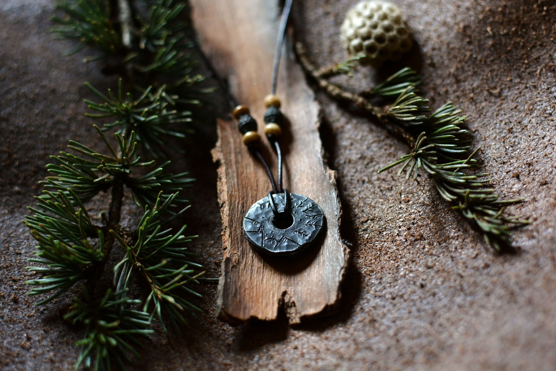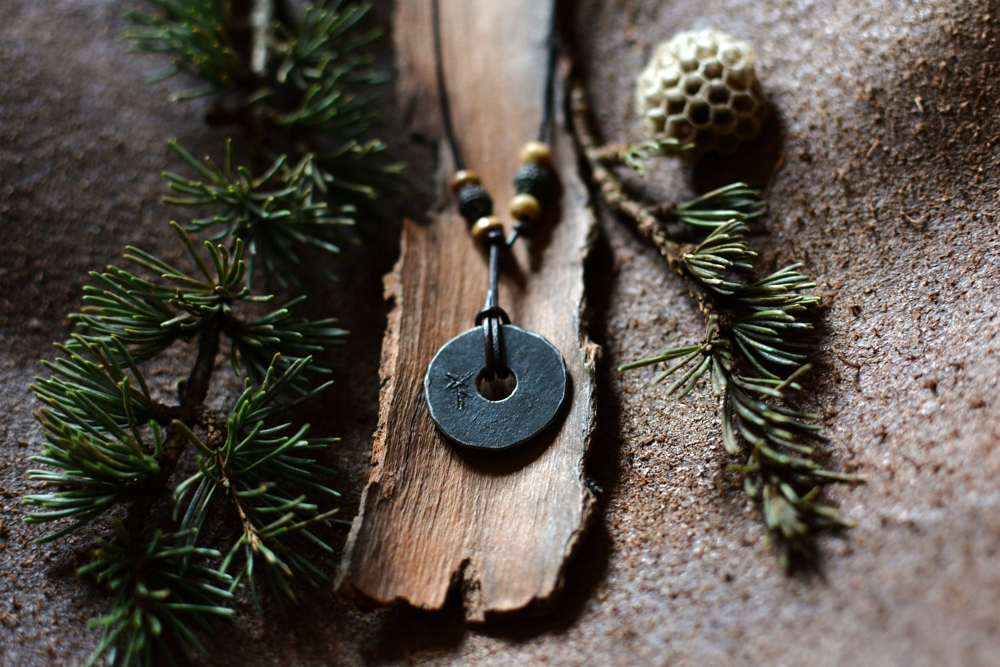 Ce pendentif en fer forgé mis en forme et martelé dans les flammes de la forge porte les marques du marteau et de l'enclume. Il a ensuite été engravé à froid à la main et monté sur un cordon en cuir ajustable orné de perles en os et bronze.