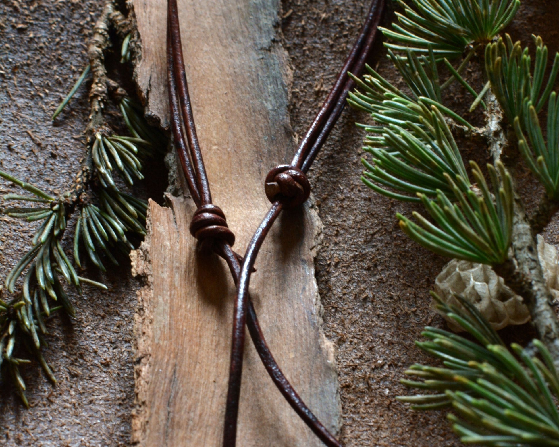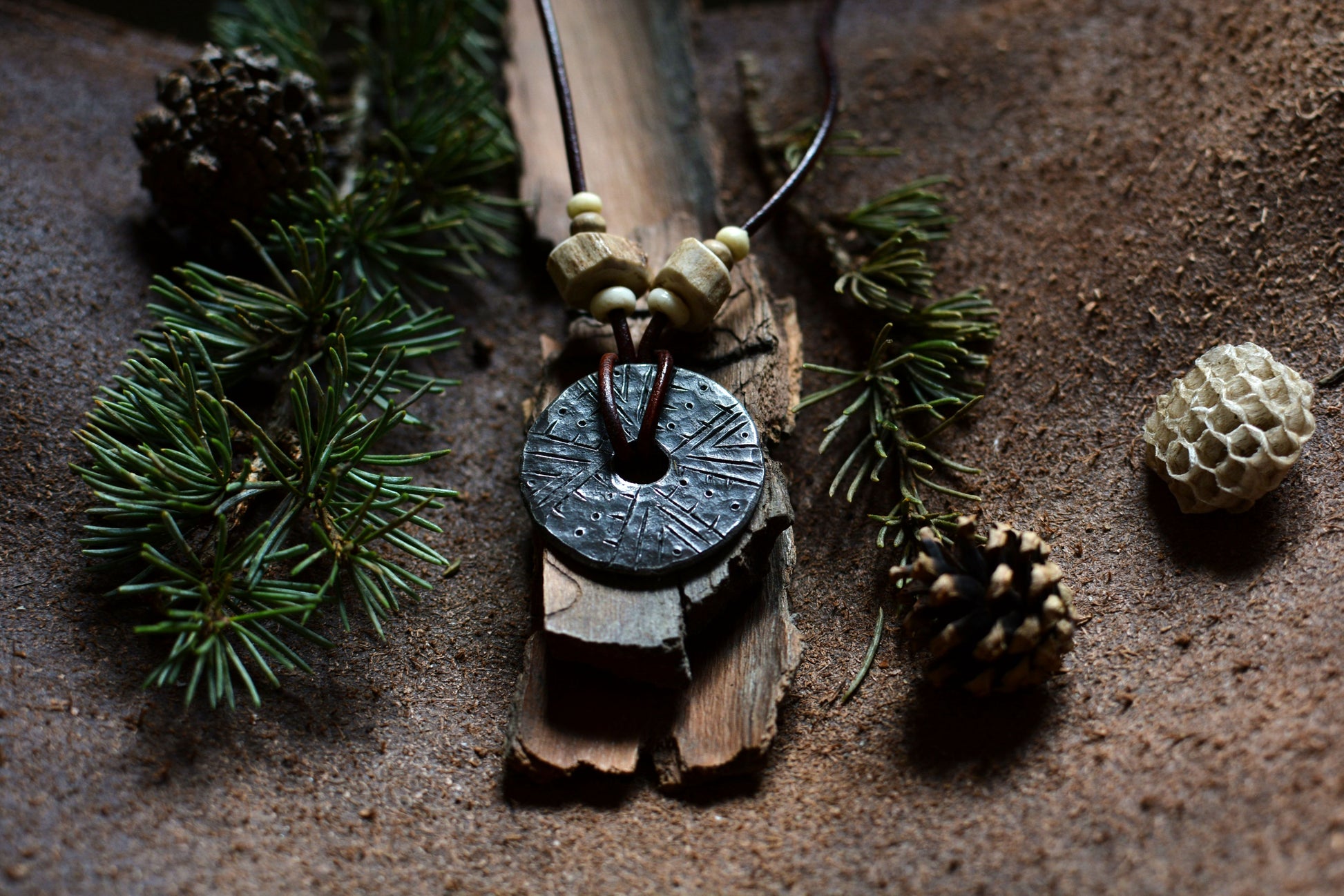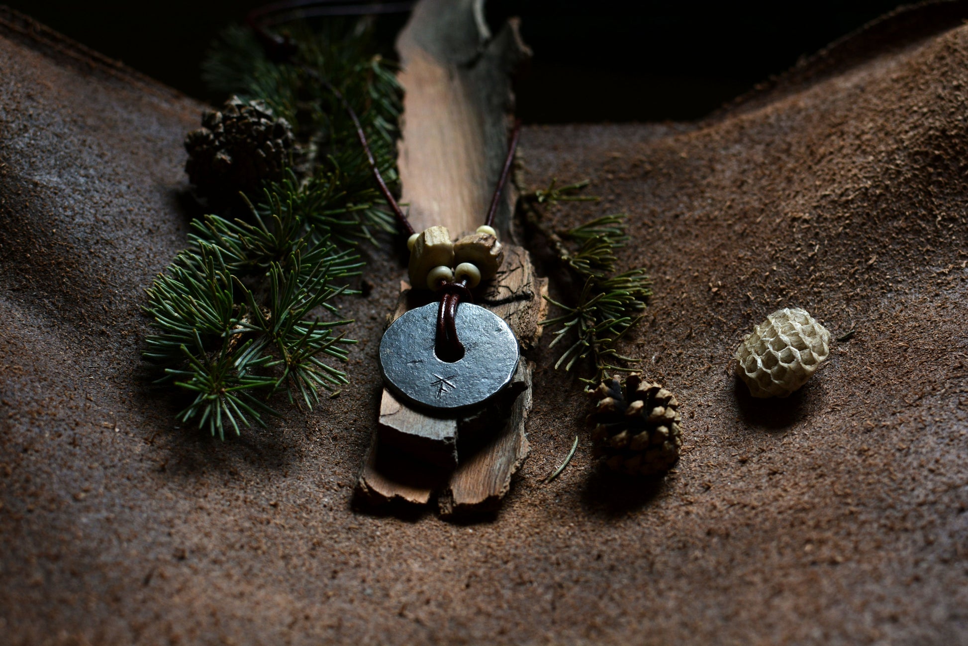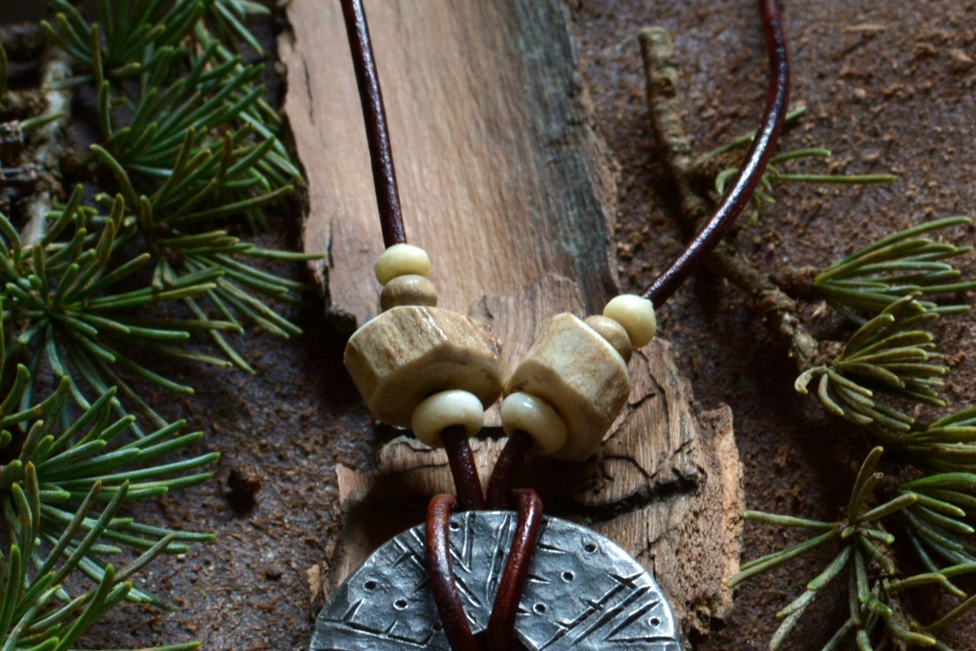Ce pendentif en fer forgé mis en forme et martelé dans les flammes de la forge porte les marques du marteau et de l'enclume. Il a ensuite été engravé à froid à la main et monté sur un cordon en cuir ajustable orné de perles en os et bois de cerf.