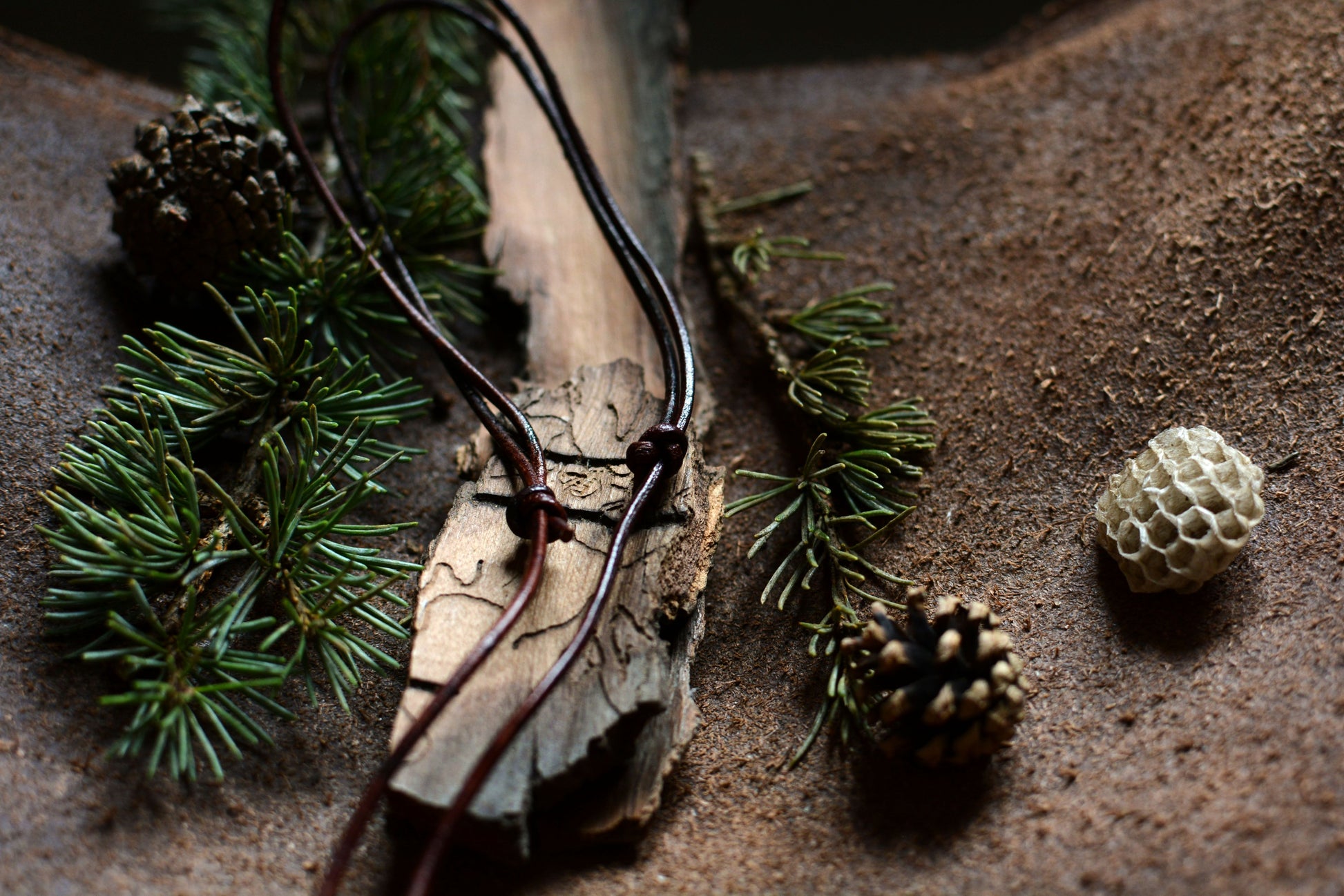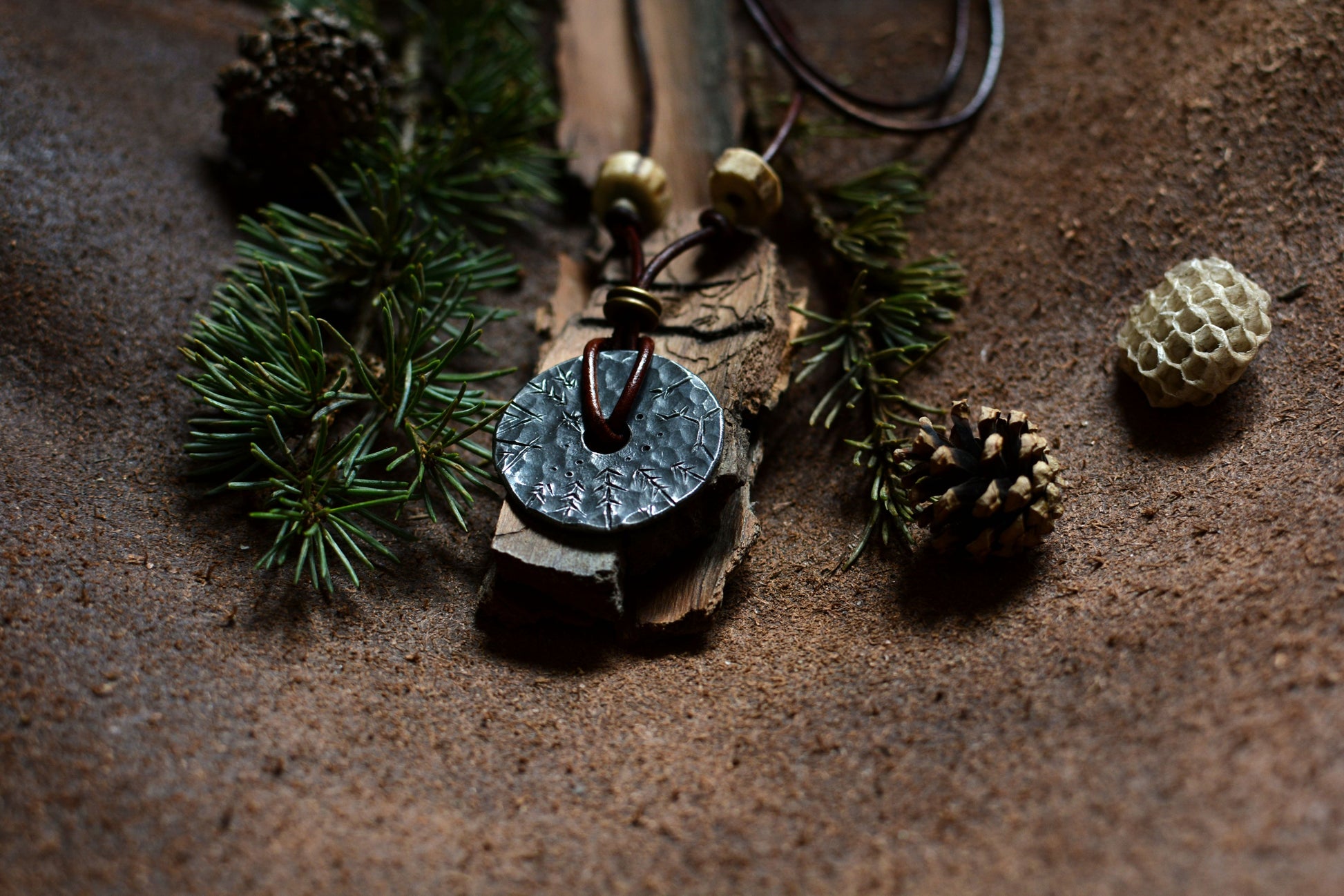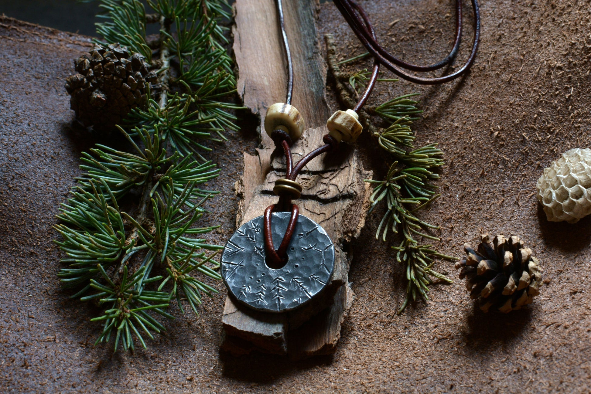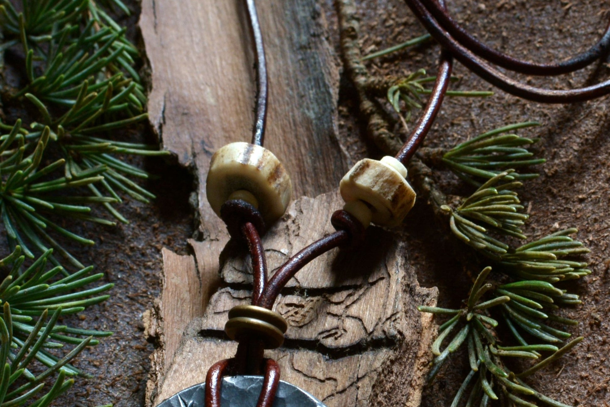 Ce pendentif en fer forgé mis en forme et martelé dans les flammes de la forge porte les marques du marteau et de l'enclume. Il a ensuite été engravé à froid à la main et monté sur un cordon en cuir ajustable orné de perles en os, bronze et bois de cerf.