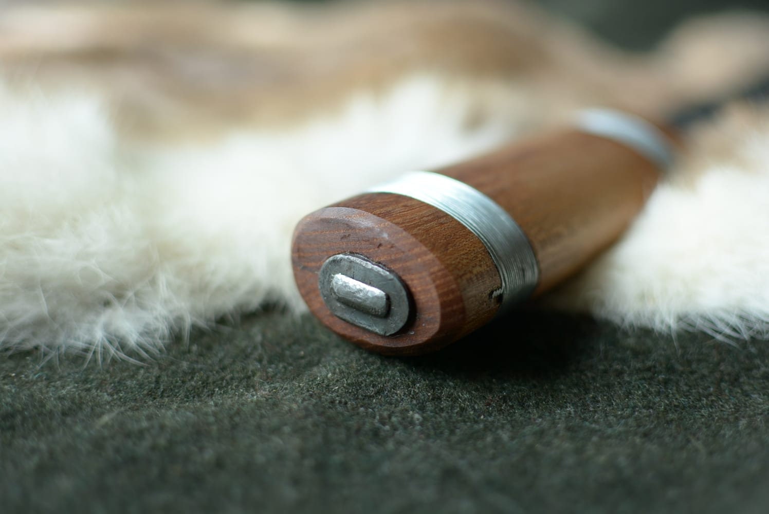 - Manche en merisier serti de deux bagues de fil de fer, le tout riveté à l'arrière pour une résistance maximum.